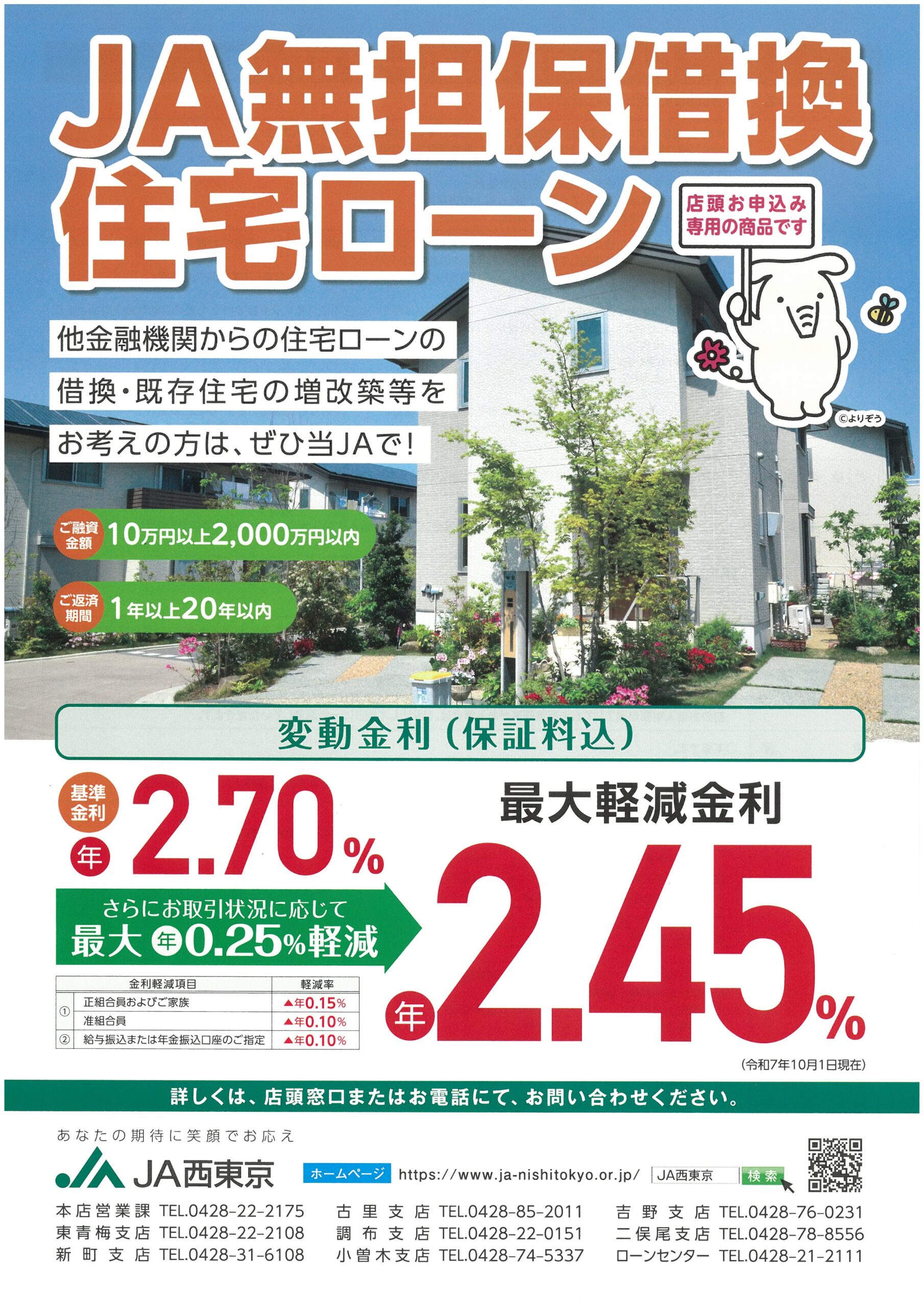 | 変動金利(住宅ローンプライムレート・保証料込) | 2.450%〜2.700% |