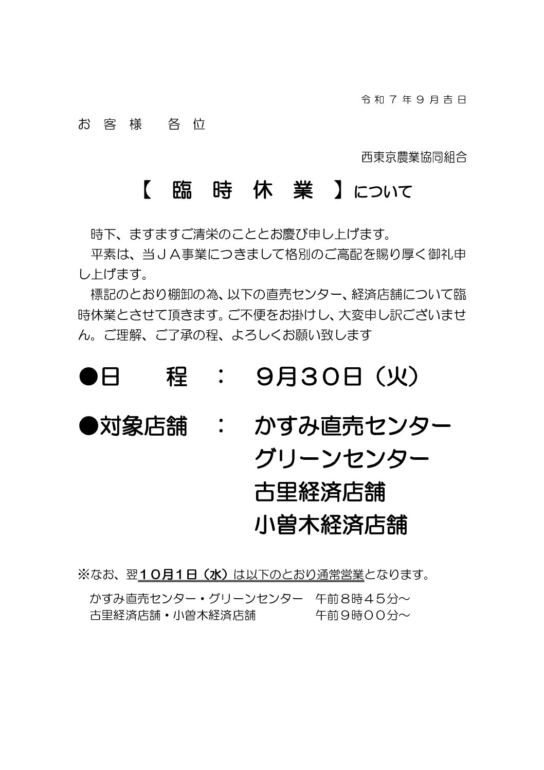 直売センター・経済店舗の9/30(火)臨時休業について