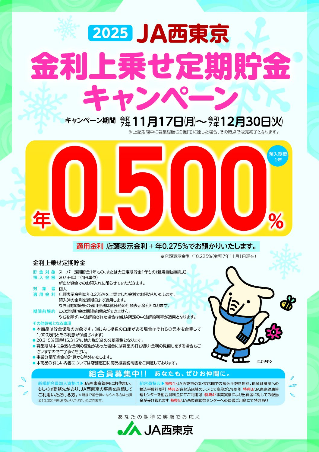 2025JA西東京金利上乗せ定期貯金キャンペーン開始 11月17日~